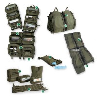 (3)各ポーチは任意に配置/分離可能。透明窓、ゴムバンド、面ファスナ仕切り付ポーチ(22.5×11.5×11.5cm)2種計8個、内部にゴムバンド、面ファスナ仕切り付ポーチ(22.5×22.5×4.5cm)2個、いずれも(4)ラベリング用面ファスナ装備